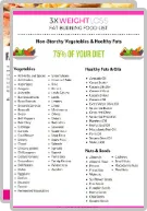 Quick reference of approved foods that burn fat, plus a handy list of fat-storing foods to avoid. Grocery shopping made easy. Just print it off & go!